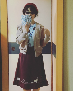 ハロウィーン仮装第2弾。「ロイヤルテネンバウムス」のマーゴです。タバコは紙を丸めただけのもの笑 マーゴ風ワンピースにはMiss PatinaのNaval